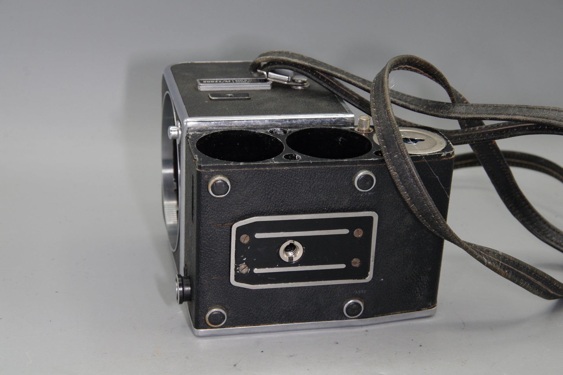 Sold as untested. Battery cover is missing. No lens, film back, or viewfinder included. Cosmetically shows signs of use including surface wear and minor marks. No visible cracks or corrosion. Offered strictly as-is.